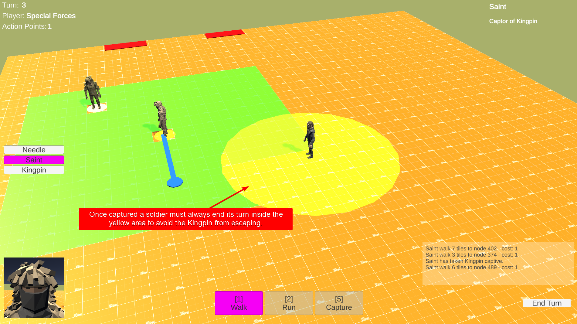 The soldier that has taken the Kingpin captive must always end his turn close enough or the Kingpin will escape again.